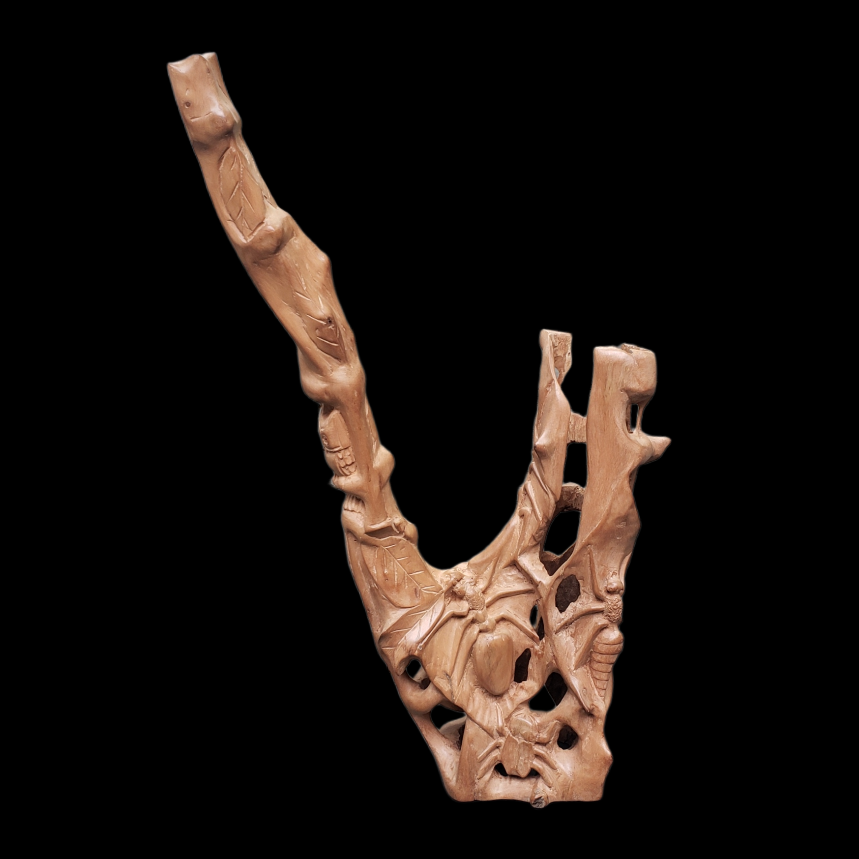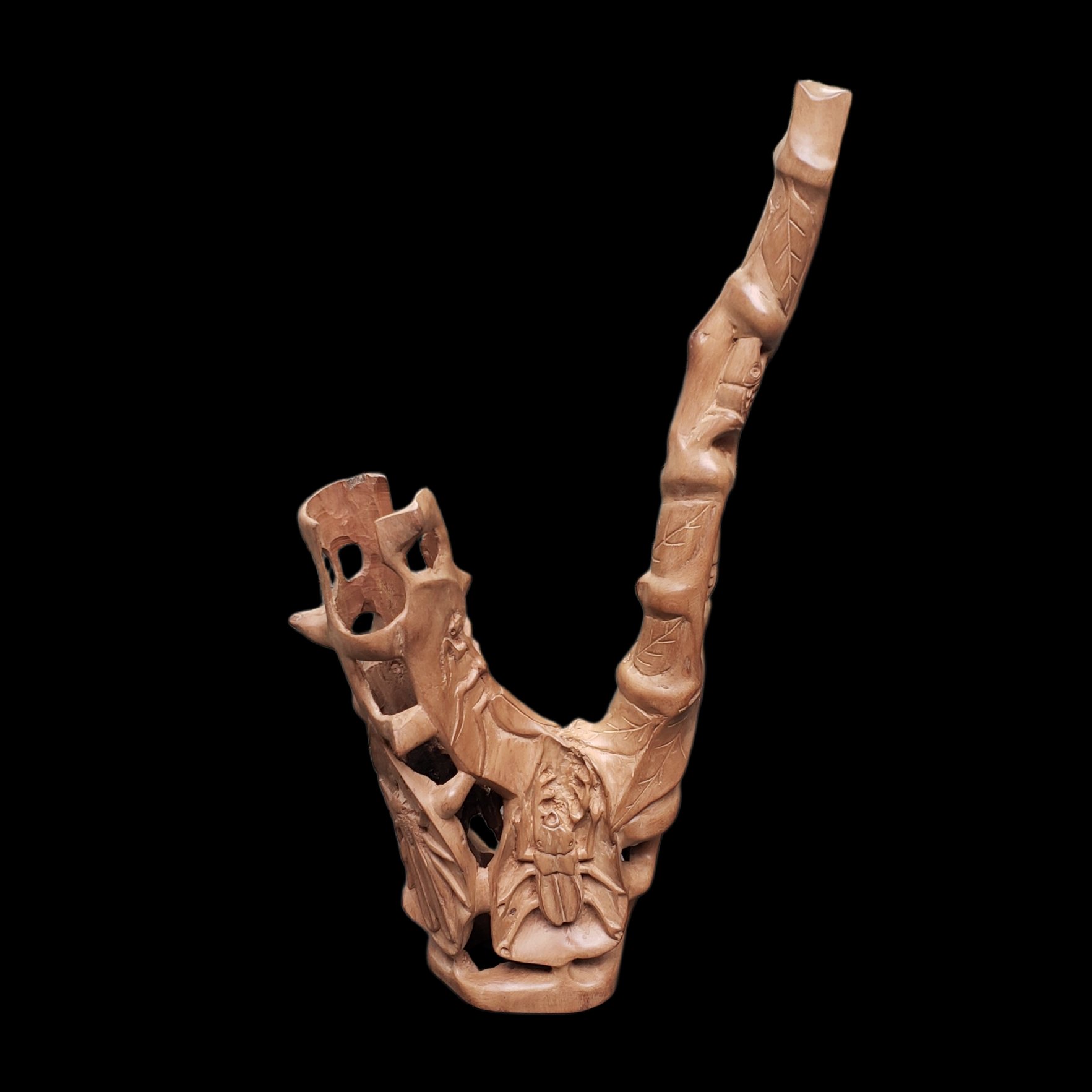 Animais, insetos e bichos imaginários vão sendo esculpidos em pedaços inteiros de madeira, sem qualquer emenda, resultando em peças únicas e inusitadas, que mostram o talento e a imaginação e criatividade do artista, cujas obras são reconhecíveis logo no primeiro olhar.