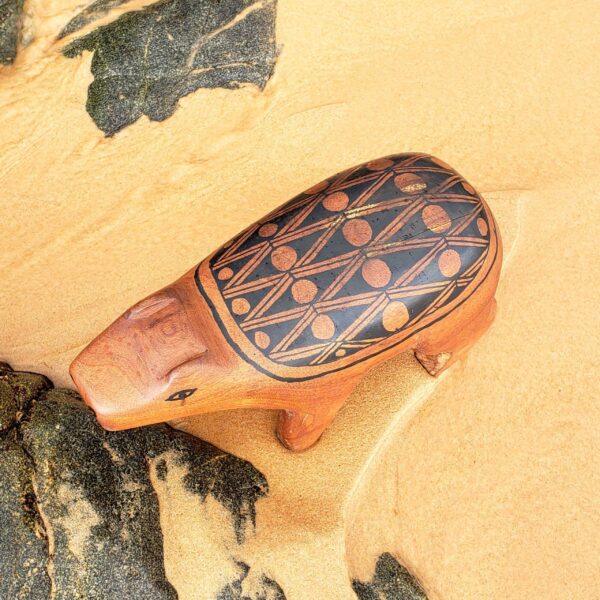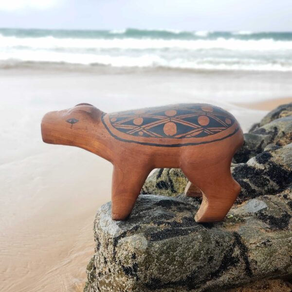 Banco talhado em madeira com formato de Capivara com grafismo da Etnia Waura, Alto do Xingu.
