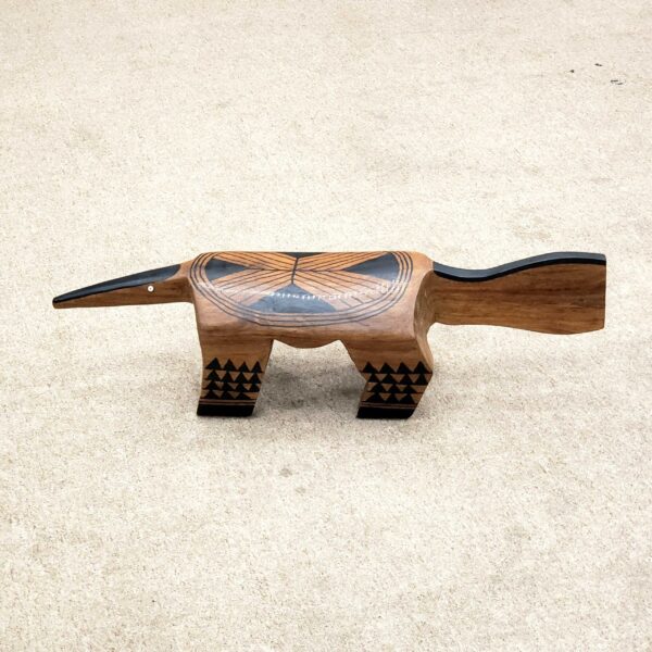 Banco talhado em madeira com formato de Tamanduá com grafismo da Etnia Waura, Alto do Xingu.