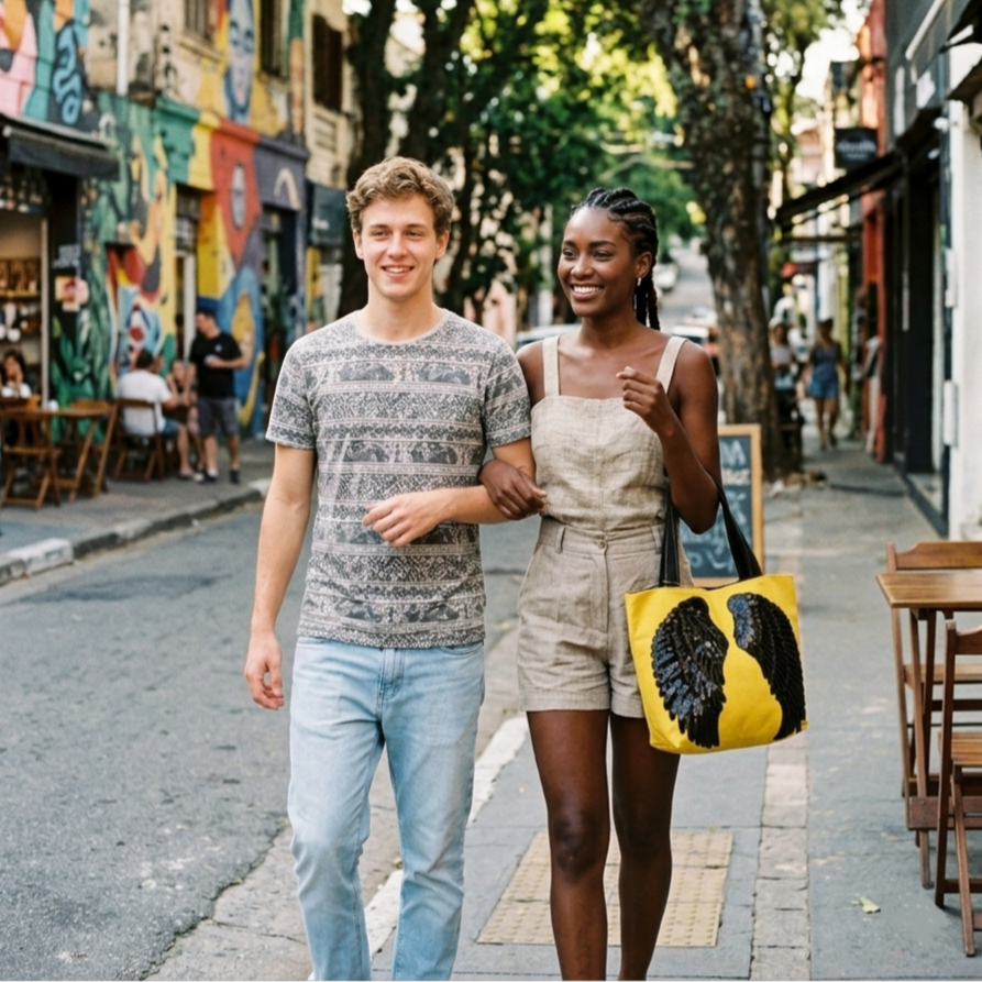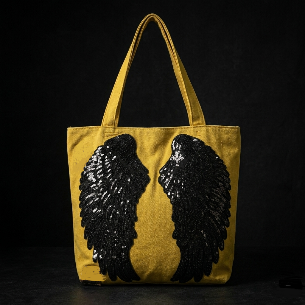 As bolsas de lona com aplicação de asas em paetê são acessórios versáteis que misturam o estilo rústico da lona com o brilho glamouroso das lantejoulas. O material de lona torna a bolsa resistente para o dia a dia ou praia, enquanto o paetê permite que ela seja usada em eventos informais à noite.