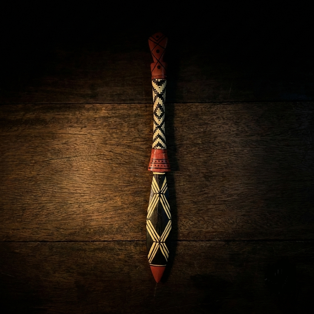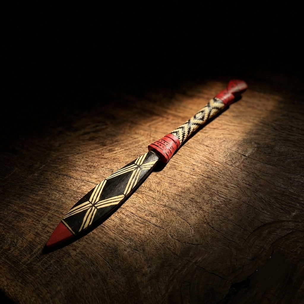 Esculpidas por homens, as bordunas são feitas de madeira dura e resistente, com acabamento em grafismos (urucum/jenipapo) e trançado de fibra de arumã, e servem tanto para uso ritual quanto decorativo, representando a cultura e identidade do povo de língua aruak.