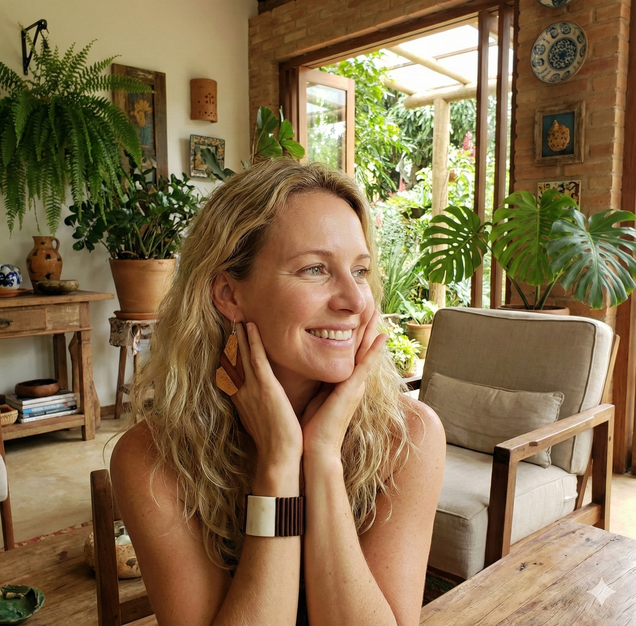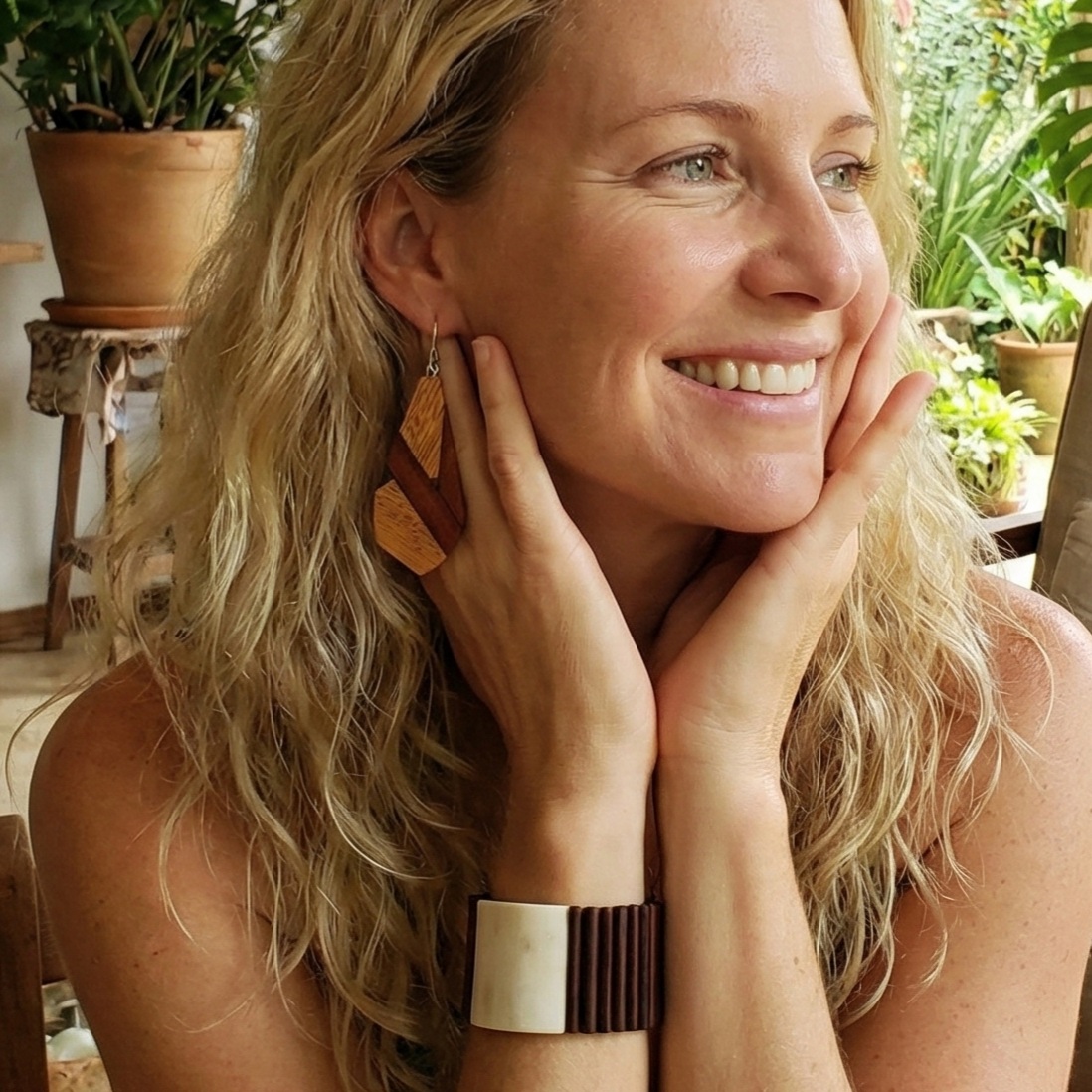 Brincos em madeira marchetada produzido em comunidade artesã às margens do Rio Negro (AM) com o reaproveitamento de resíduos de madeiras da construção naval, importante atividade econômica da região.