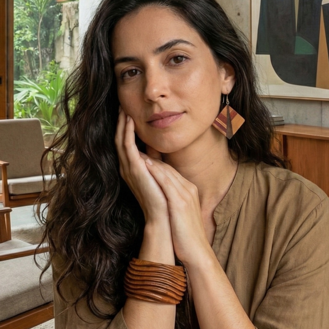 Brincos em madeira marchetada produzido em comunidade artesã às margens do Rio Negro (AM) com o reaproveitamento de resíduos de madeiras da construção naval, importante atividade econômica da região.