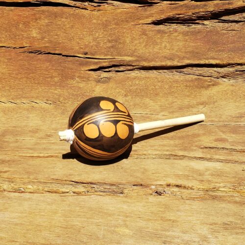 Chocalho em cabaça produzido artesanalmente por artesã do povo Juruna, um grupo indígena do Pará, Brasil, e utilizada na culinária e para outras finalidades cotidianas.