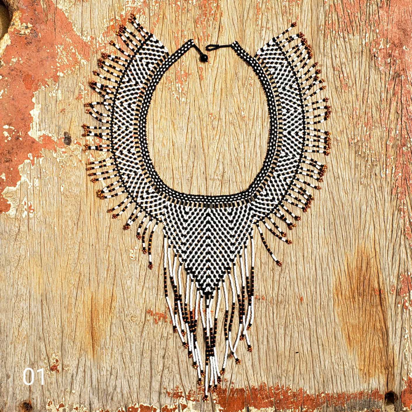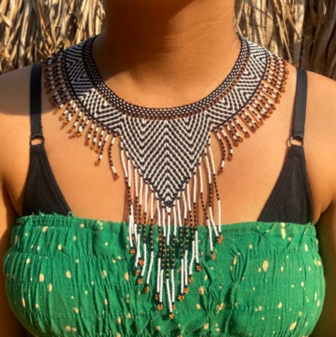 Colar produzida com miçangas por mulheres indígenas de etnia Mehinako da Terra Indígena do Xingu.