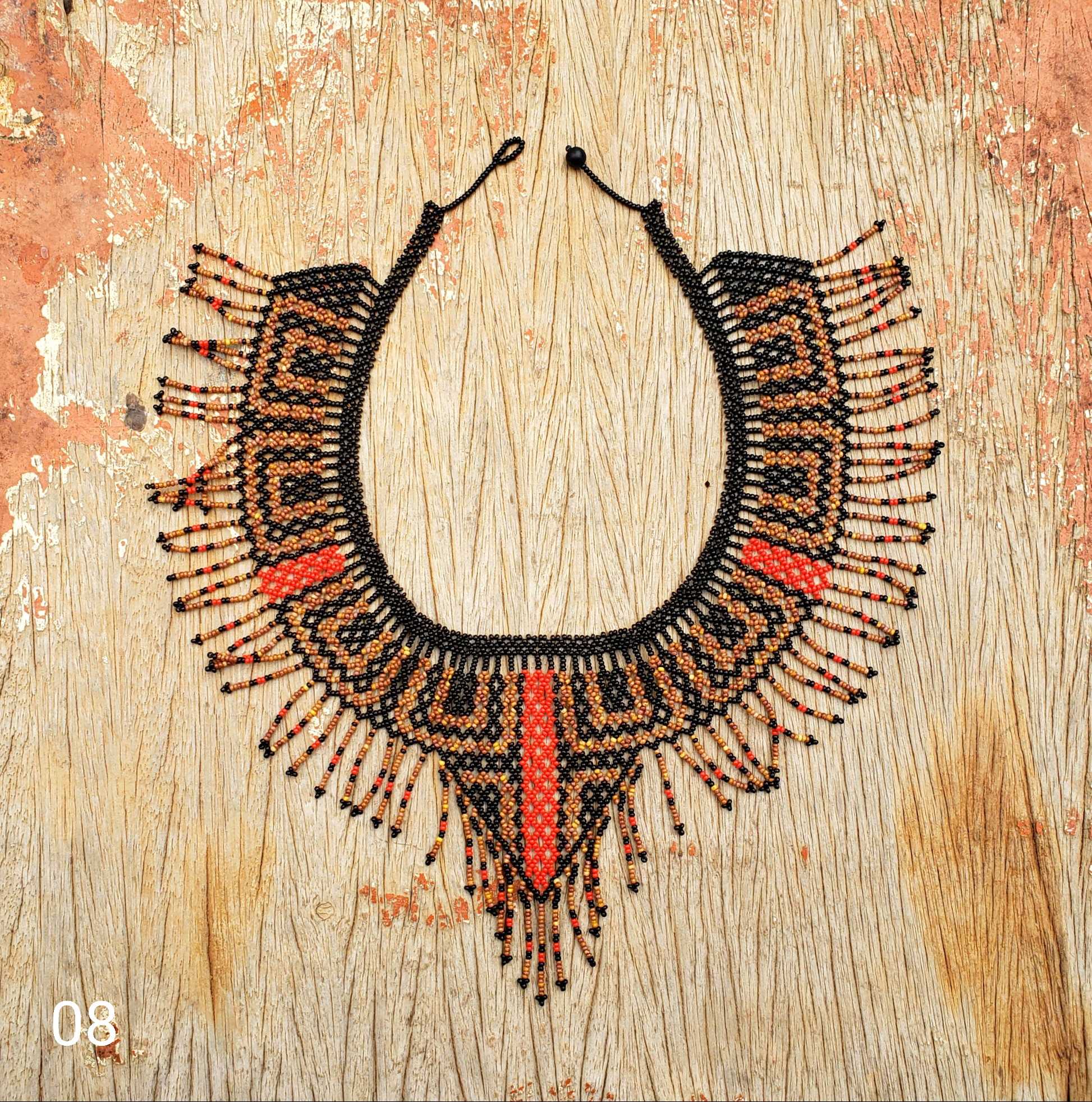 Colar produzida com miçangas por mulheres indígenas de etnia Mehinako da Terra Indígena do Xingu.