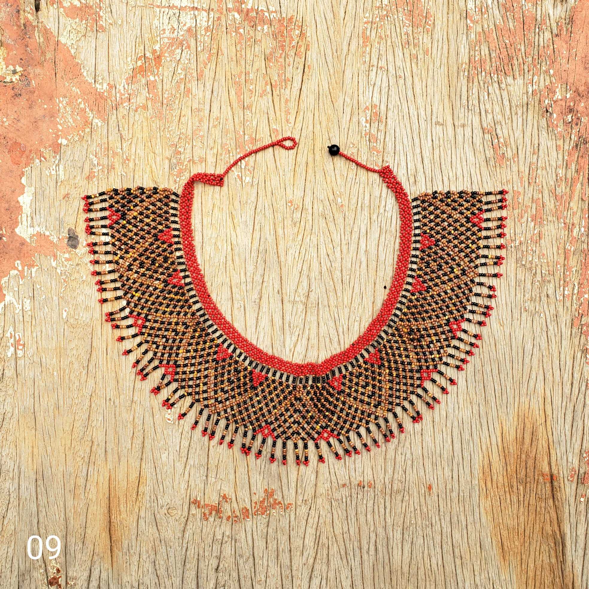 Colar produzida com miçangas por mulheres indígenas de etnia Mehinako da Terra Indígena do Xingu.