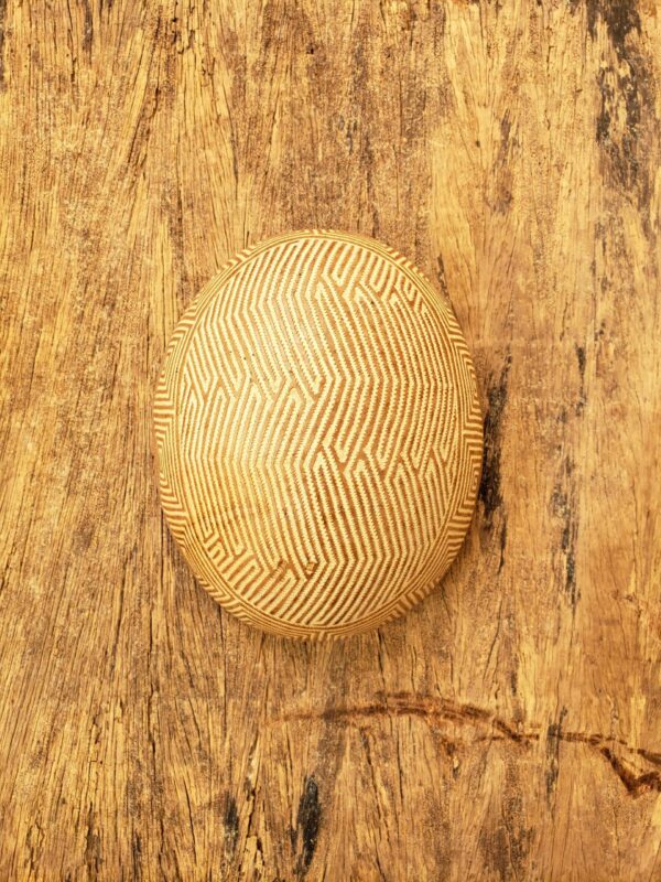 O Recipiente em forma de cumbuca é entalhado à mão e a parte interna pintada com jenipapo e carvão. As cuias Tapirapé destacam-se por apresentar um trabalho minucioso de entalhamento que fazem parte da cosmovisão da etnia Tapirapé. São complexos grafismos que cobrem toda a superfície da peça.
