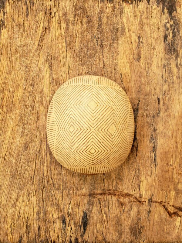 O Recipiente em forma de cumbuca é entalhado à mão e a parte interna pintada com jenipapo e carvão. As cuias Tapirapé destacam-se por apresentar um trabalho minucioso de entalhamento que fazem parte da cosmovisão da etnia Tapirapé. São complexos grafismos que cobrem toda a superfície da peça.