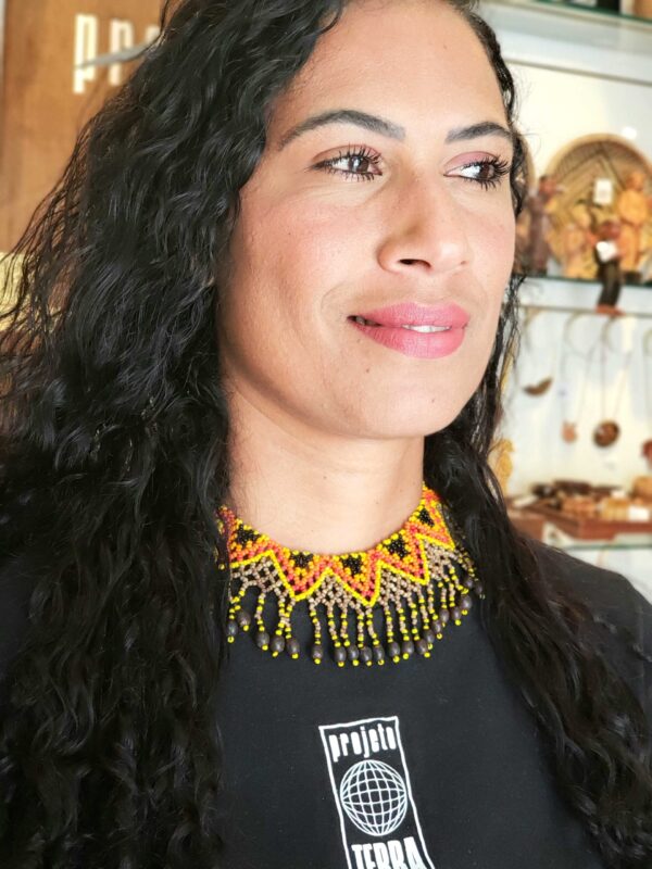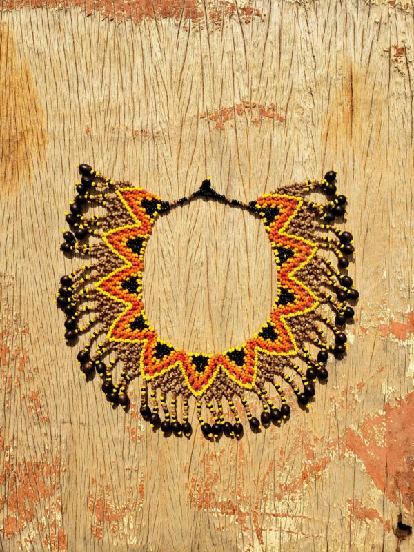 As Gargantilhas Guajajara são feitas com o uso princioal de semente de tiririca, misturadas com miçangas coloridas.