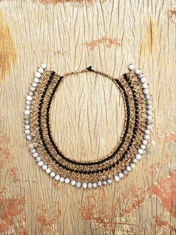 As Gargantilhas Guajajara são feitas com o uso princioal de semente de tiririca, misturadas com miçangas coloridas.