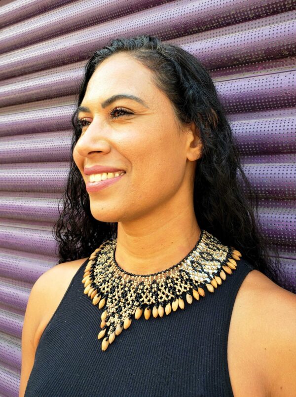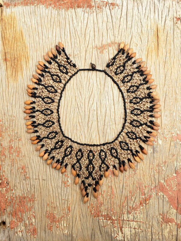 As Gargantilhas Guajajara são feitas com o uso princioal de semente de tiririca, misturadas com miçangas coloridas.