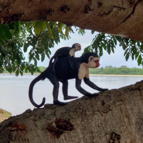 Reprodução de macaco prego com filhote, modelado manualmente em balata por artesão da etnia Macuxi na região de Boa Vista, Roraima.