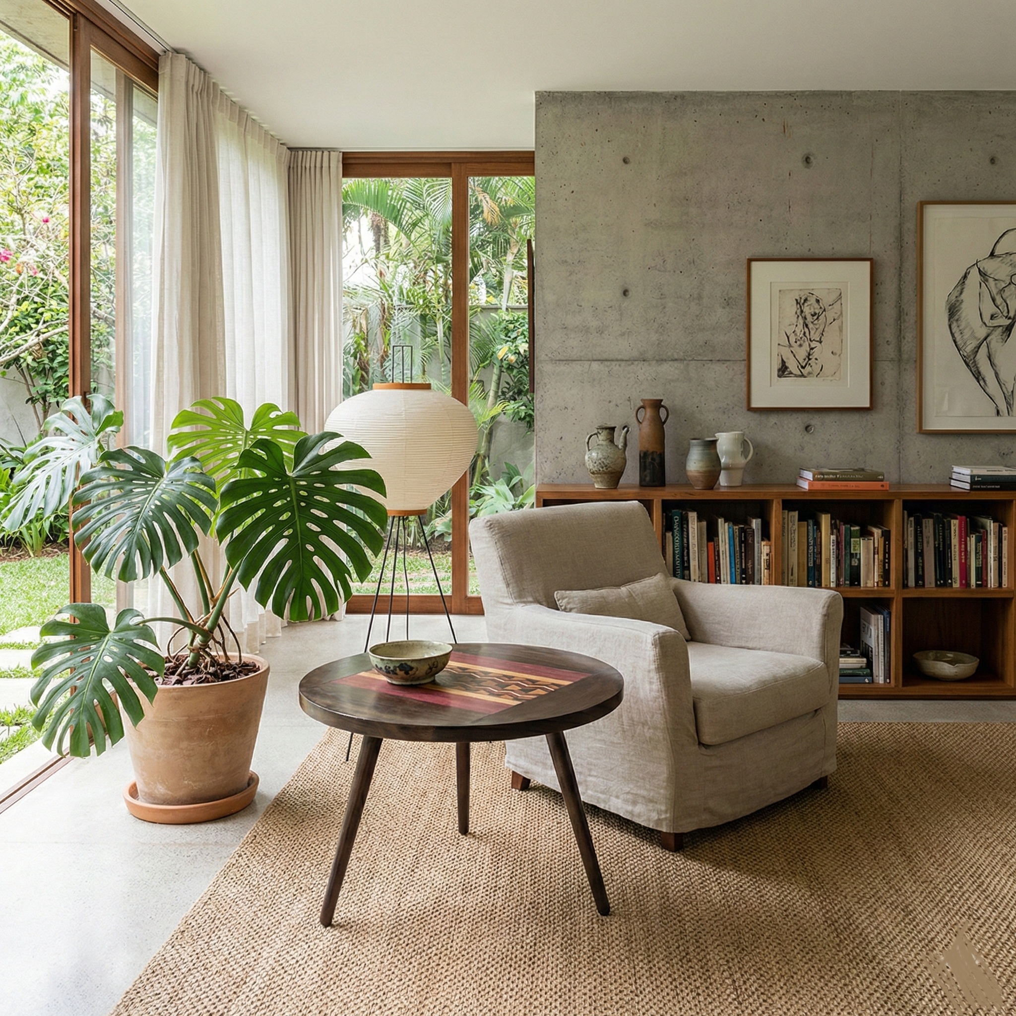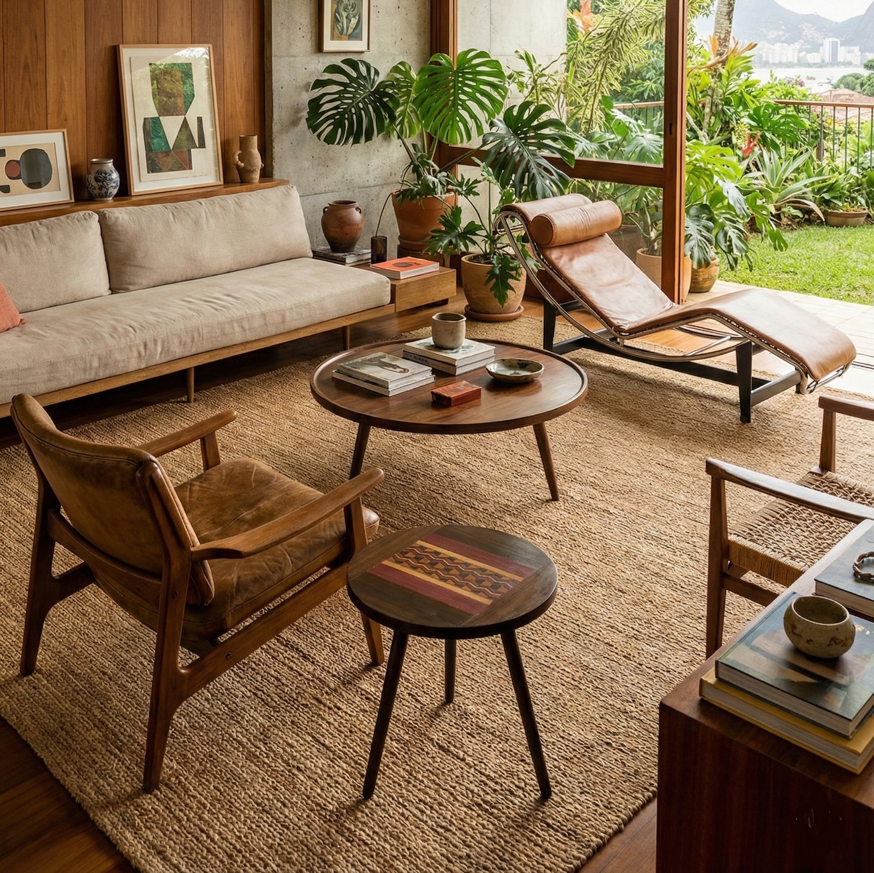 Mesa em madeira marchetada produzido em comunidade artesã às margens do Rio Negro (AM) com o reaproveitamento de resíduos de madeiras da construção naval, importante atividade econômica da região.