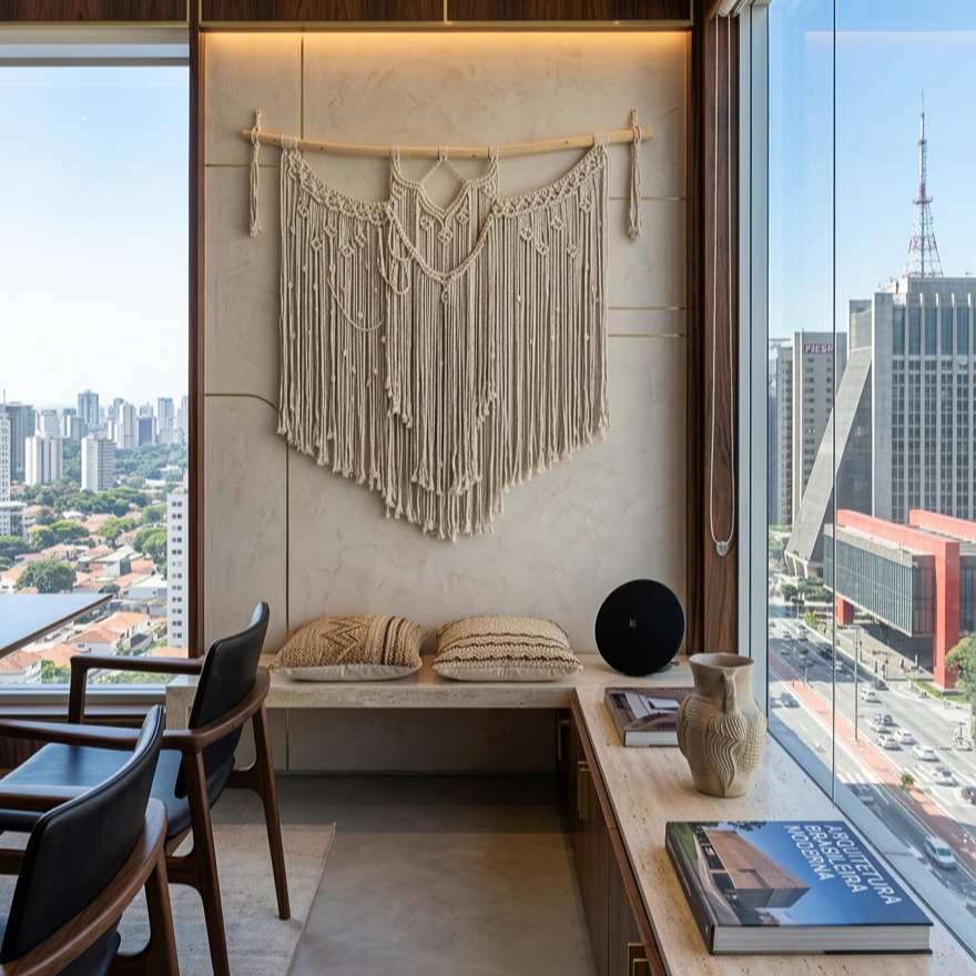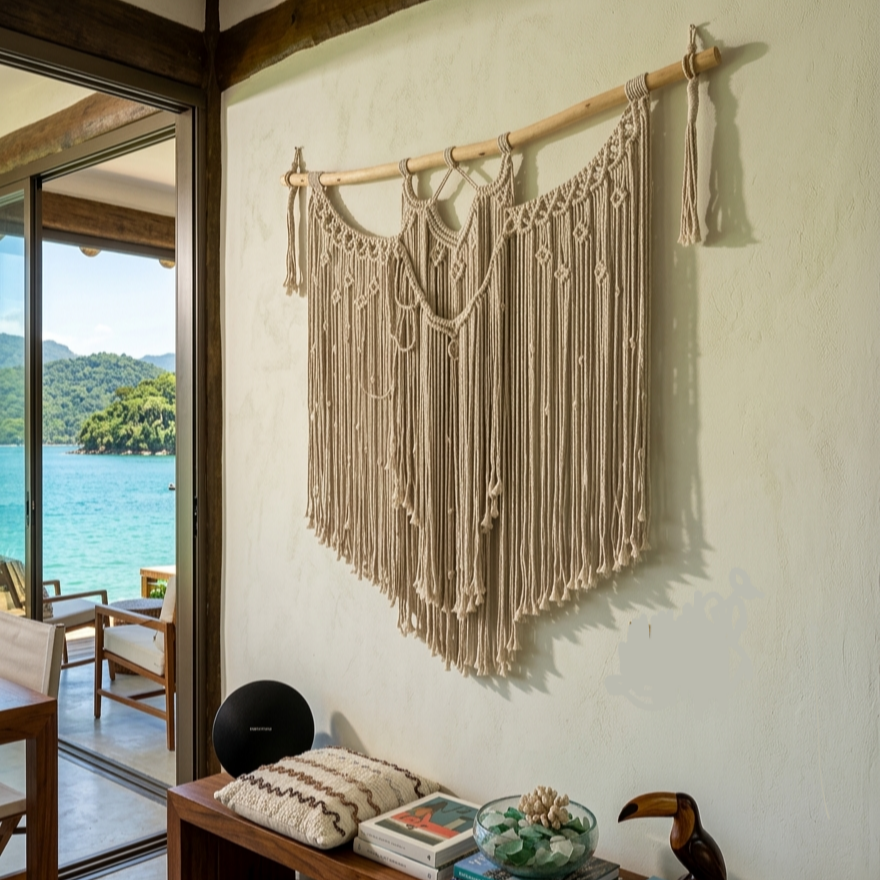 Mais do que um simples artesanato, o macramê adquiriu um estatuto de sofisticação no design contemporâneo. Quando aplicado em peças decorativas — como painéis de parede, cortinas, luminárias ou suportes para plantas — ele confere ao ambiente uma estética refinada e artesanal, valorizada especialmente em projetos de interiores que privilegiam materiais naturais e acabamentos feitos à mão.