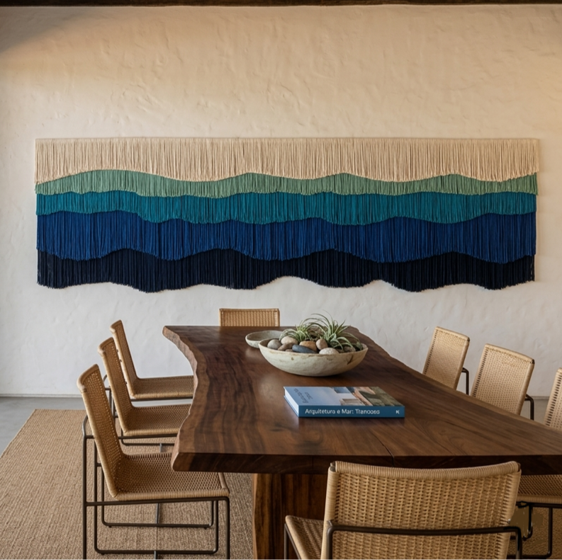 Uma escolha sofisticada para trazer textura, movimento e aconchego para o ambiente, com uma pegada Boho Chic, mas se adapta bem a estilos escandinavos, rústicos ou modernos, dependendo da cor e do tipo de fio.