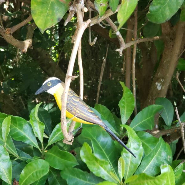 É ali que busca inspiração para fazer seus trabalhos esculpindo em madeiras reaproveitadas peças com formas da natureza. Sua arte faz com que galhos e troncos se transformem em pássaros imaginários, com desenhos e cores alegres que trazem alegria para qualquer ambiente.