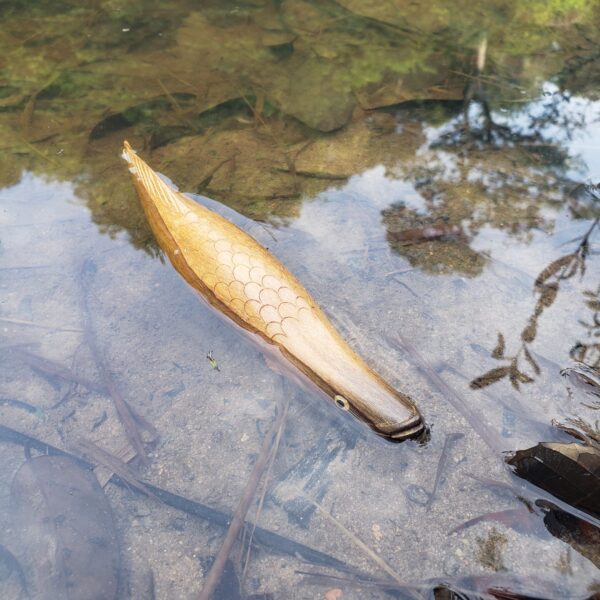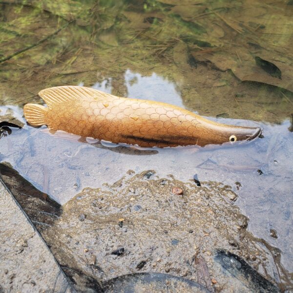 Escultura de Pirarucu produzida em comunidade artesã às margens do Rio Negro (AM) com o reaproveitamento de resíduos de madeiras da construção naval, importante atividade econômica da região.