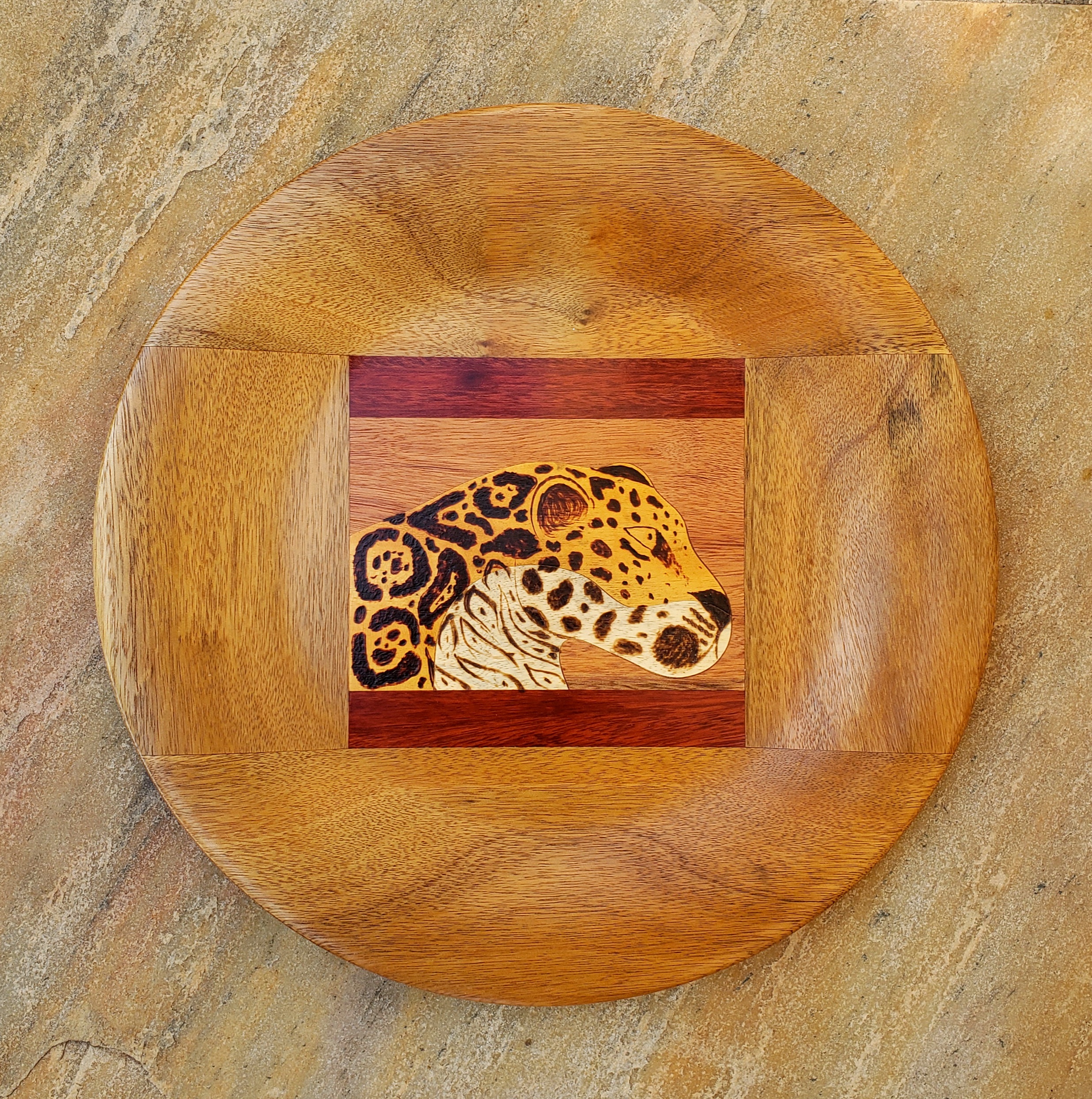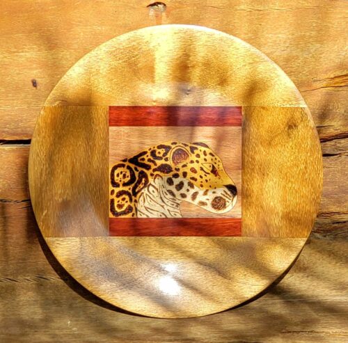 Prato em madeira marchetada produzido em comunidade artesã às margens do Rio Negro (AM) com o reaproveitamento de resíduos de madeiras da construção naval, importante atividade econômica da região.