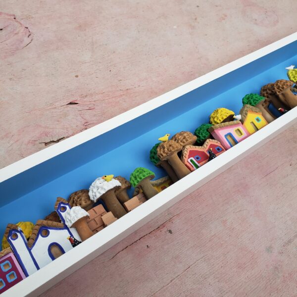 Quadrinho em madeira com peças em argila produzido pela artista Edson Santos, de Minas Gerais.