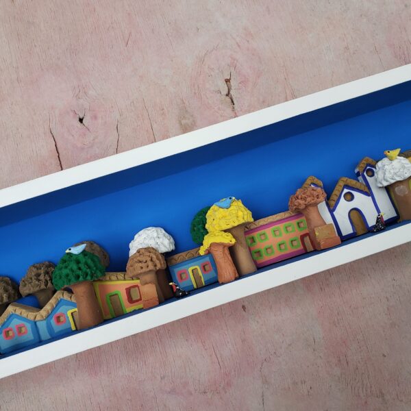 Quadrinho em madeira com peças em argila produzido pela artista Edson Santos, de Minas Gerais.