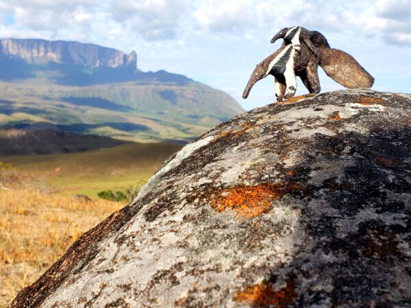 Reprodução de tamanduá bandeira com filhote, modelado manualmente em balata por artesão da etnia Macuxi na região de Boa Vista, Roraima.