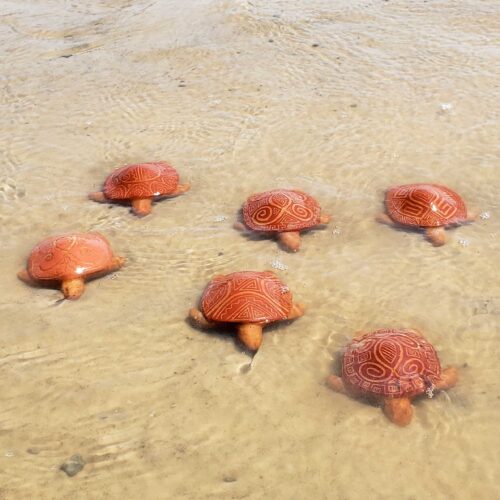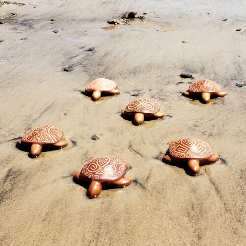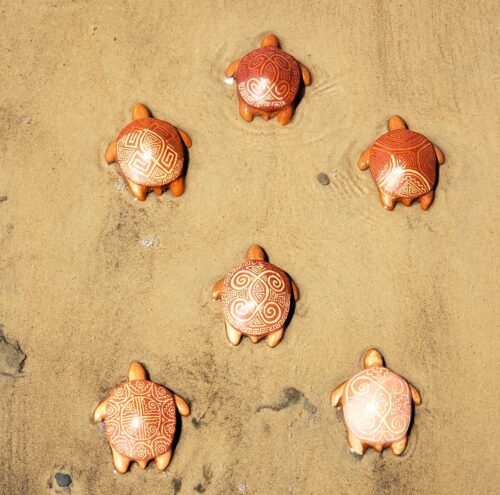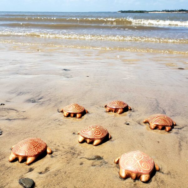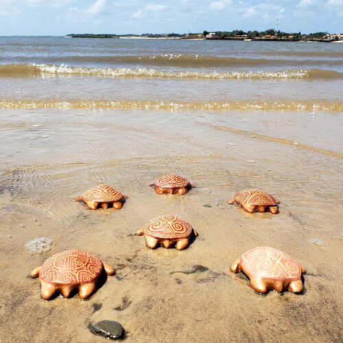 Embora cada peça seja diferente de todas as outras, há padrões de formas geométricas na arte marajoara, aplicadas com esmêro por Elen, a artista que criou e produz as tartaruguinhas.