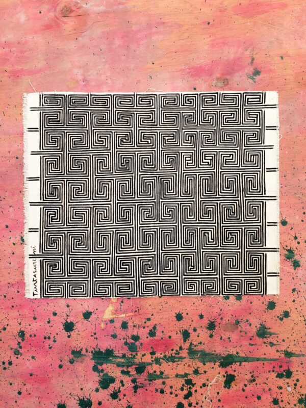 Tela pintada em tecido com tinta orgânica de jenipapo e carvão por artista da etnia Asurini.