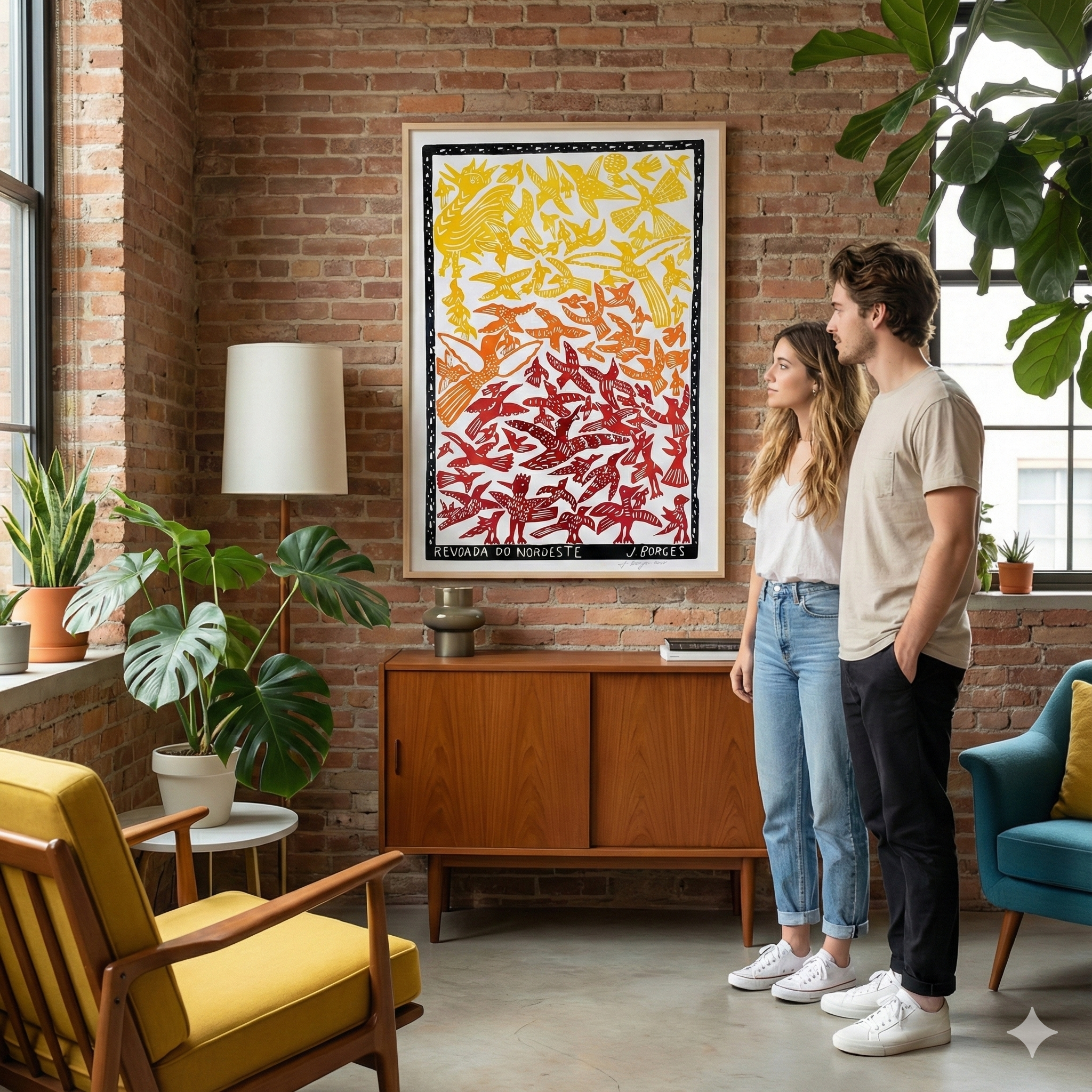 Em madeiras como a imburana e o louro canela, usadas no entalhe cuidadoso das matrizes que dão origem às gravuras, mestre J. Borges reinventa e dá novos significados ao imaginário nordestino. Um universo em plena expansão e densamente povoado por figuras encantadas, seres alados, animais, anjos, o povo e sua resiliência, cangaceiros, vaqueiros, cantadores, entre outros tantos heróis populares talhados sob o sol do Sertão.